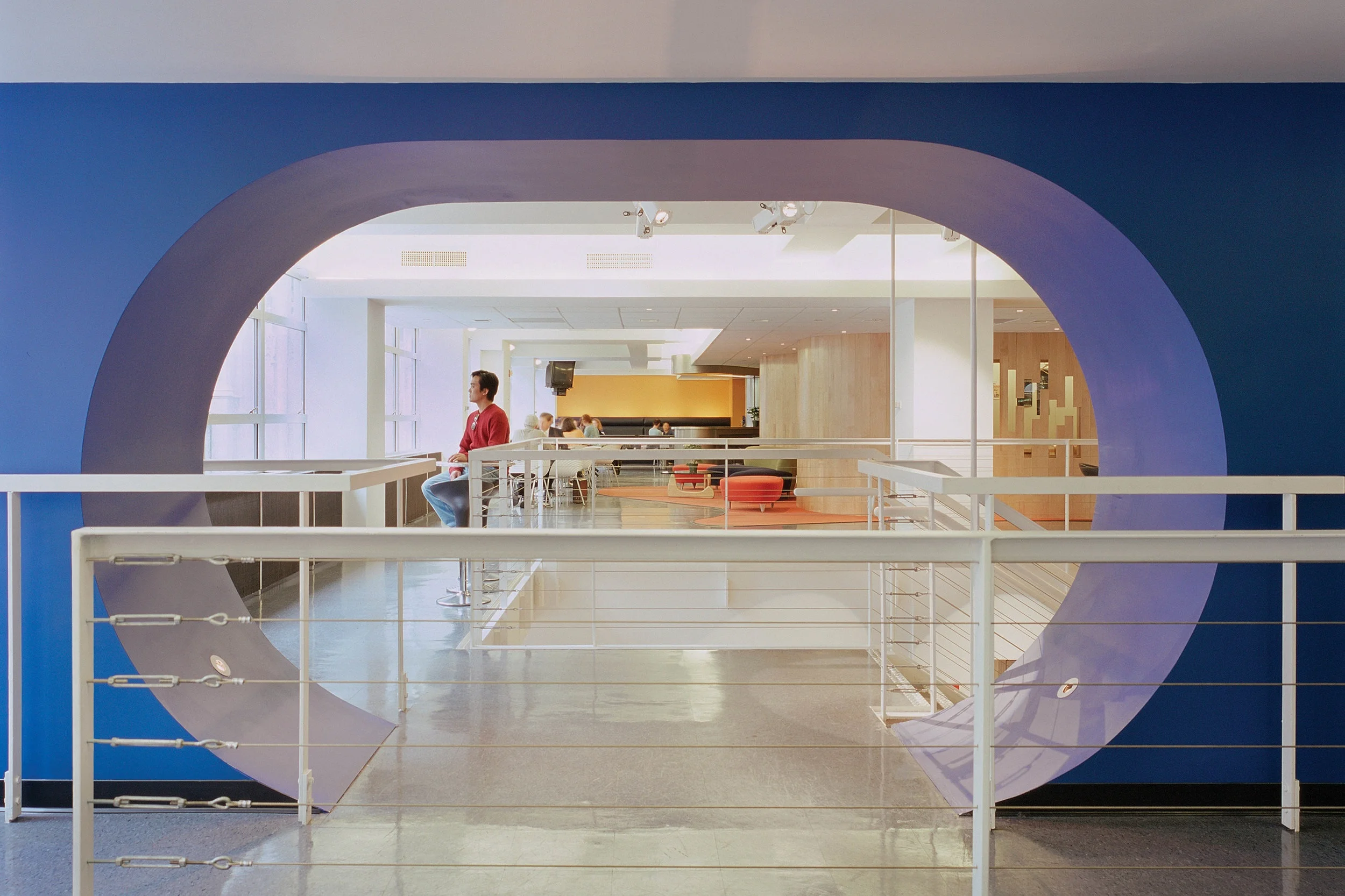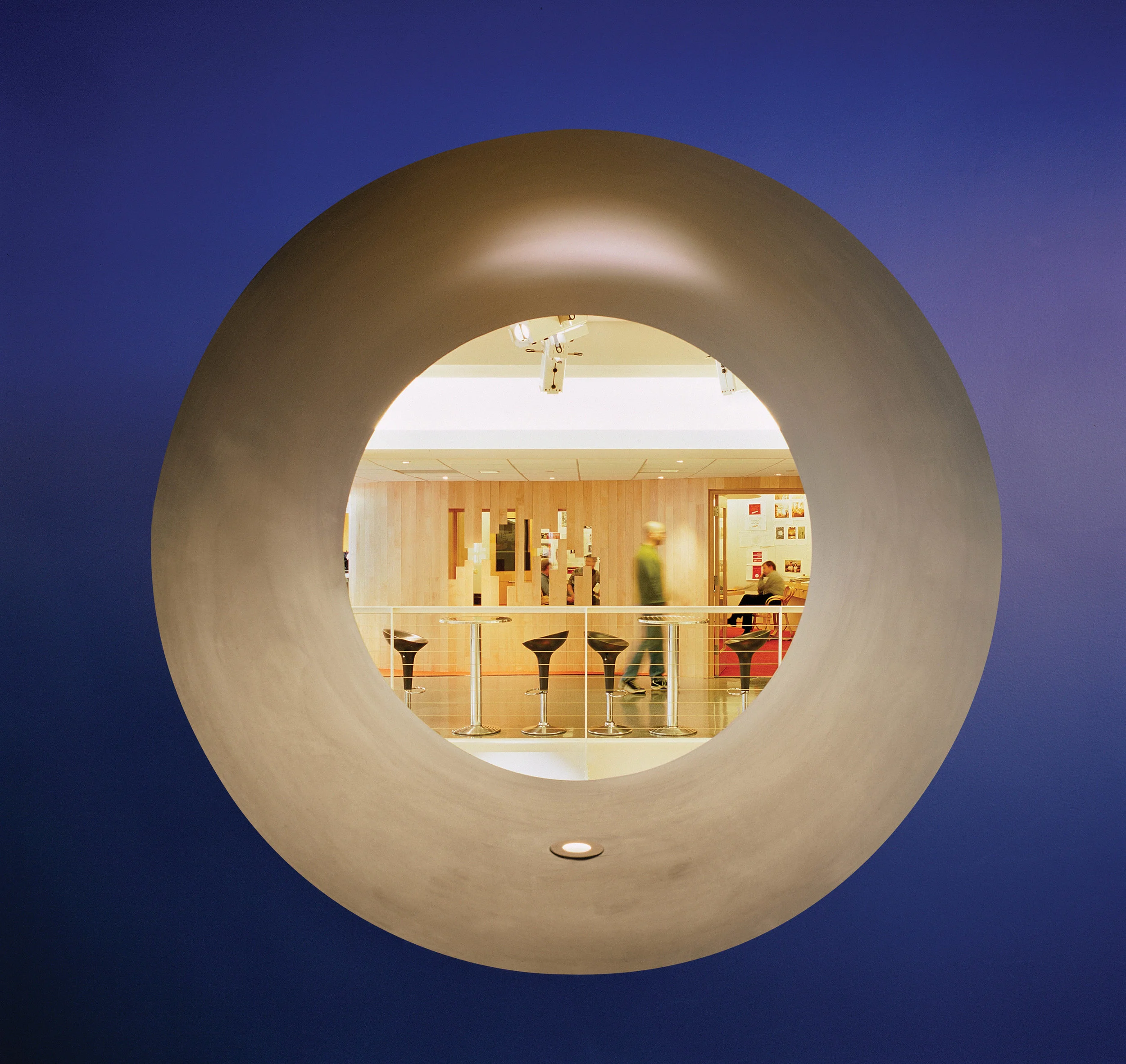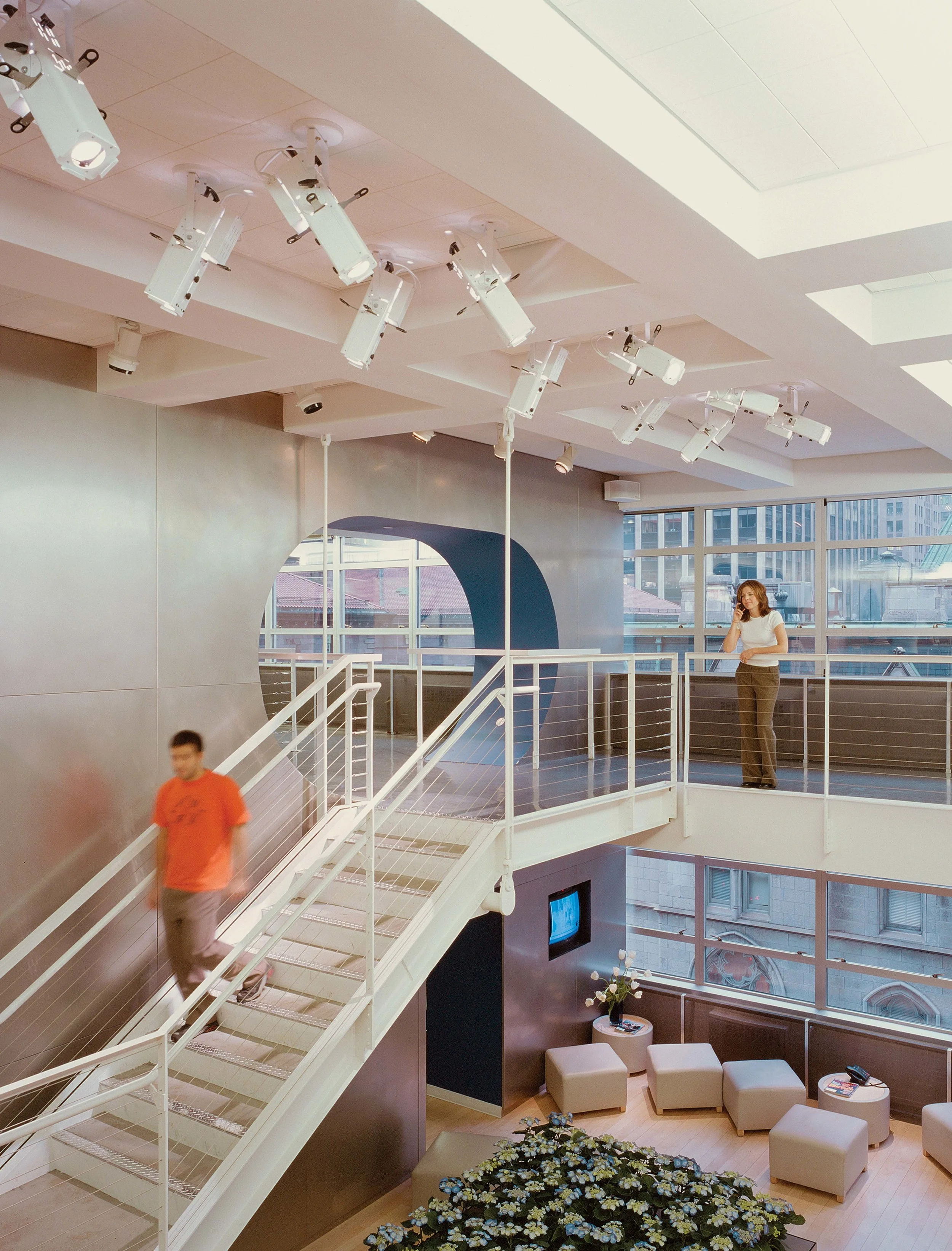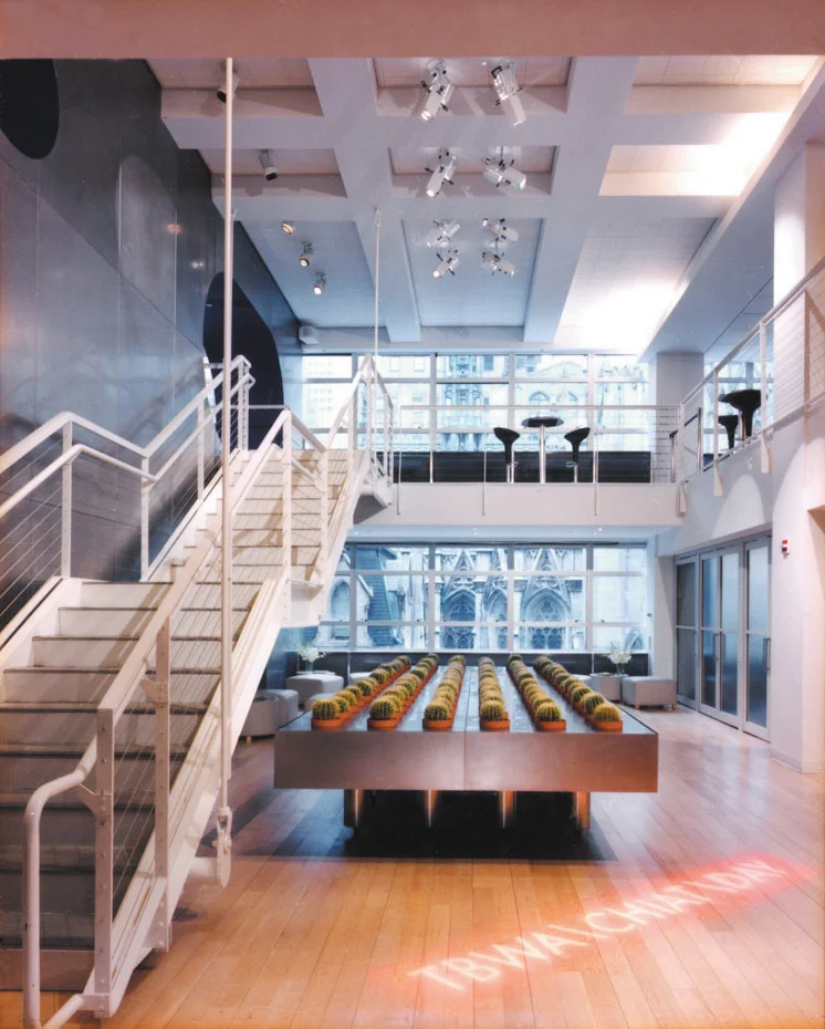 As the big city sibling of TBWA\Chiat\Day, the New York offices were designed in 1999 to support a fast-paced agency, and capture the character of New York in its public face. The Madison Avenue building carries traces of postwar modernism and art deco, and provided a subtle but distinct urban context. While work areas are a functional open architecture, the public areas were opened up, connecting the two floors with a dramatic atrium. Rising above this atrium is a stainless steel ship-like wall, screening the open work areas, with porthole openings. Meeting rooms, the art studio and the Clubhouse open onto the space. The central atrium houses a custom aluminum table with 90° apertures to accommodate small flowerpots that could be purchased from street vendors. The piece is a reference to the controlled but vital cultivation of nature in the City.