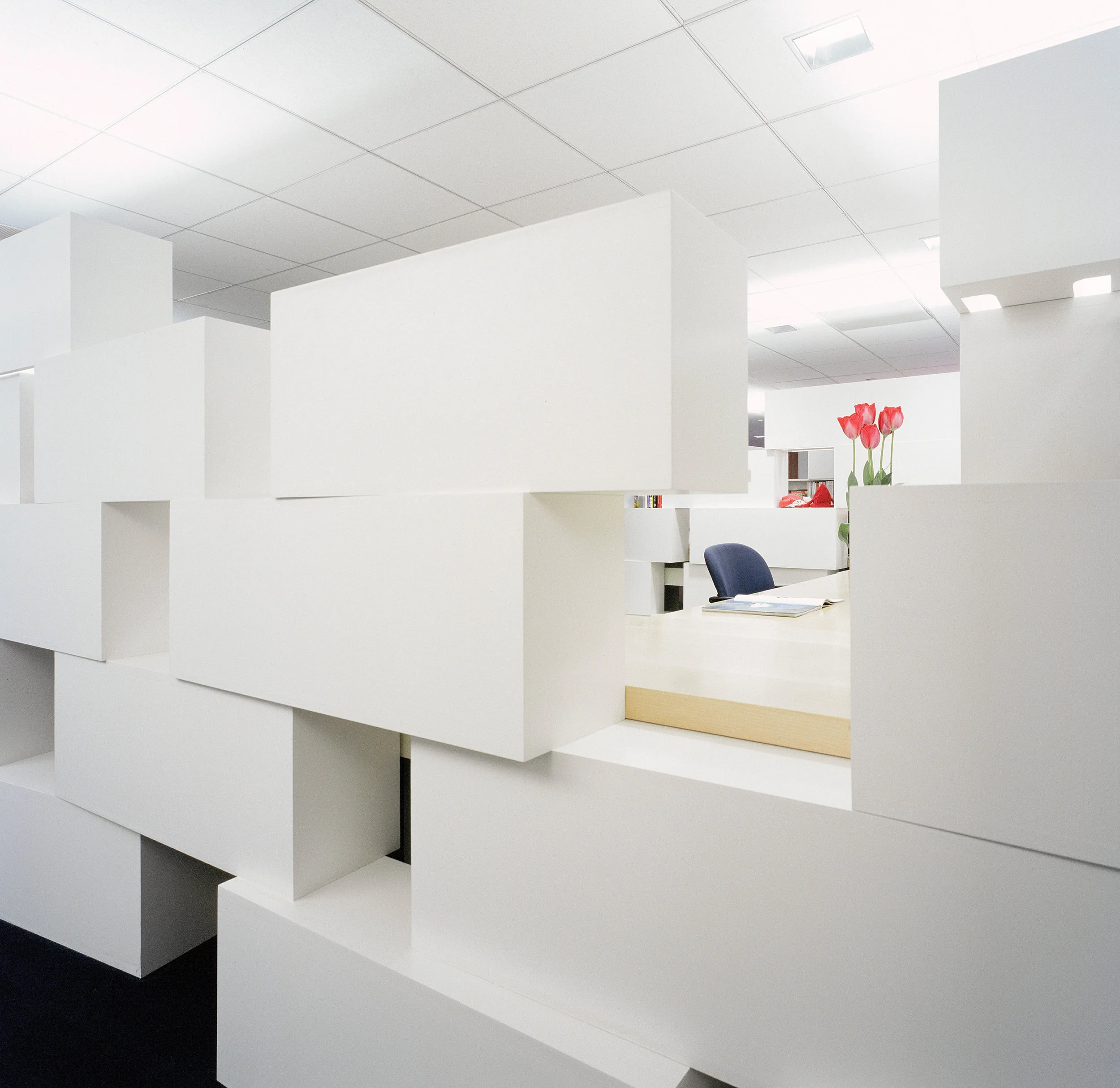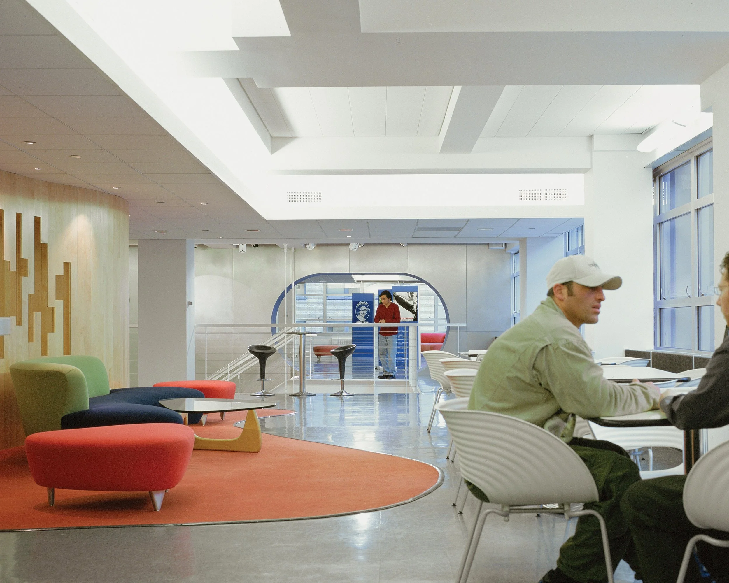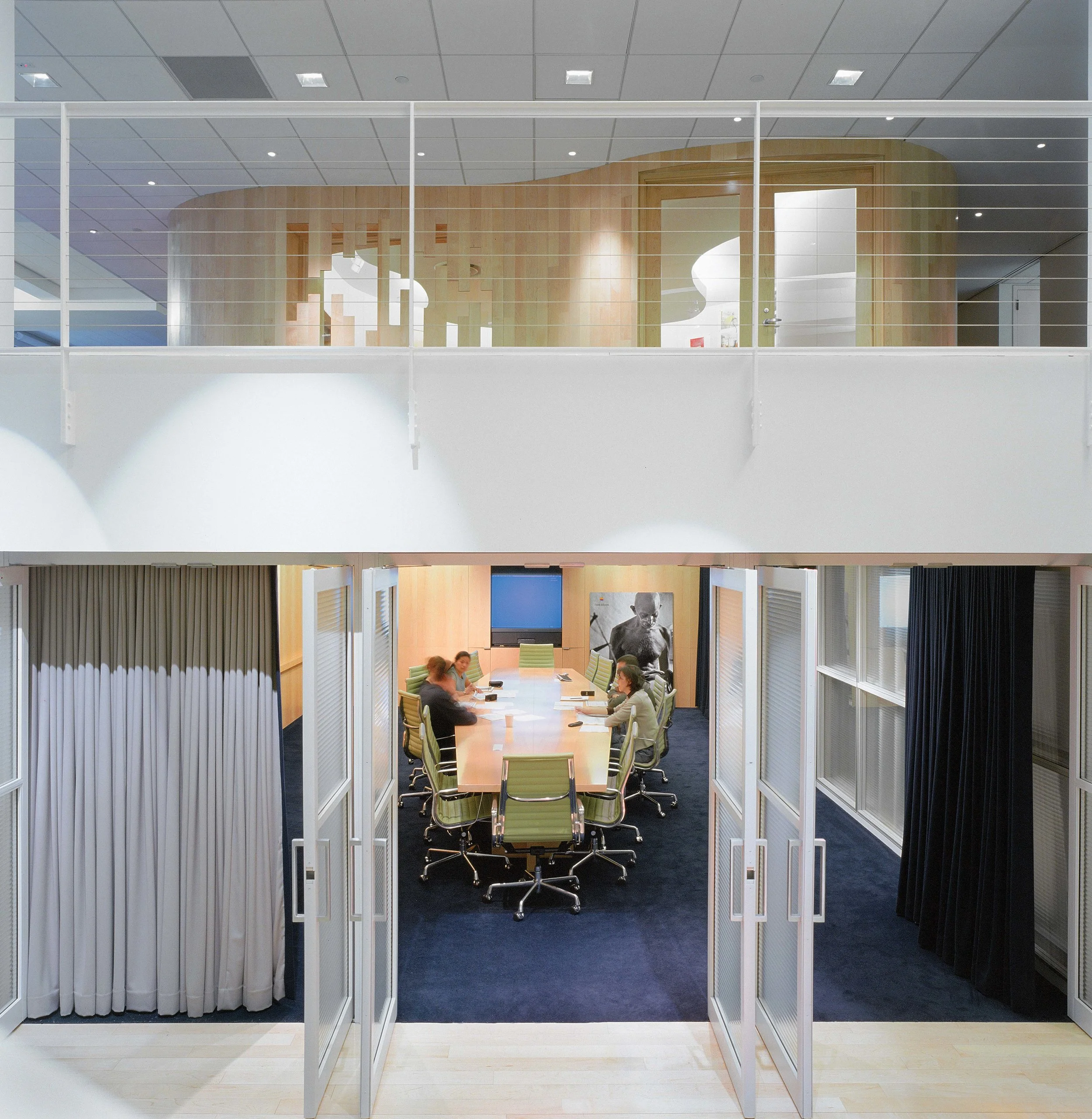 As the big city sibling of TBWA\Chiat\Day, the New York offices were designed in 1999 to support a fast-paced agency, and capture the character of New York in its public face. The Madison Avenue building carries traces of postwar modernism and art deco, and provided a subtle but distinct urban context. While work areas are a functional open architecture, the public areas were opened up, connecting the two floors with a dramatic atrium. Rising above this atrium is a stainless steel ship-like wall, screening the open work areas, with porthole openings. Meeting rooms, the art studio and the Clubhouse open onto the space. The central atrium houses a custom aluminum table with 90° apertures to accommodate small flowerpots that could be purchased from street vendors. The piece is a reference to the controlled but vital cultivation of nature in the City.